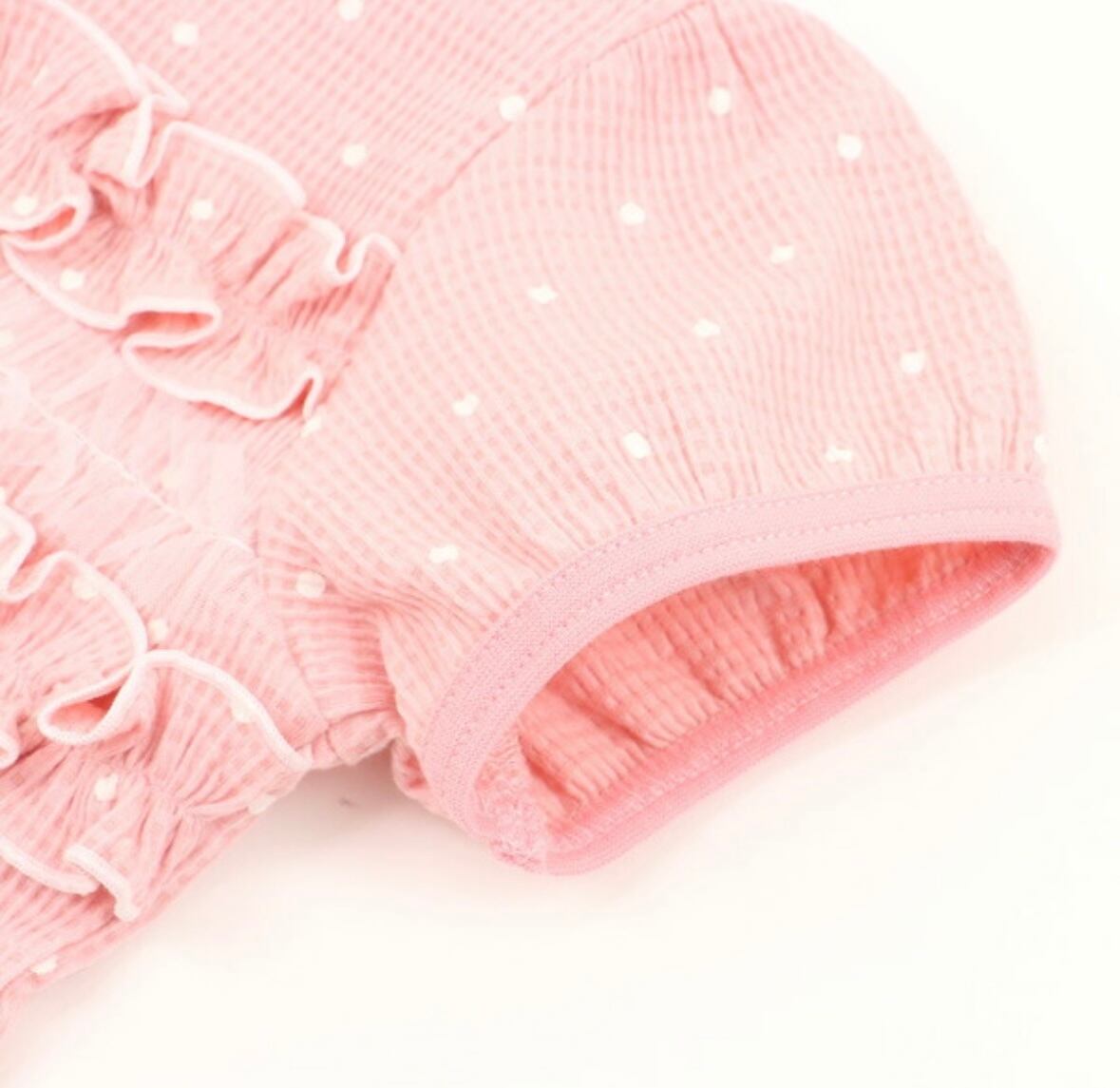 コンパクトなパフスリーブに、ドット柄&フリルがガーリーさ満載のTシャツです。