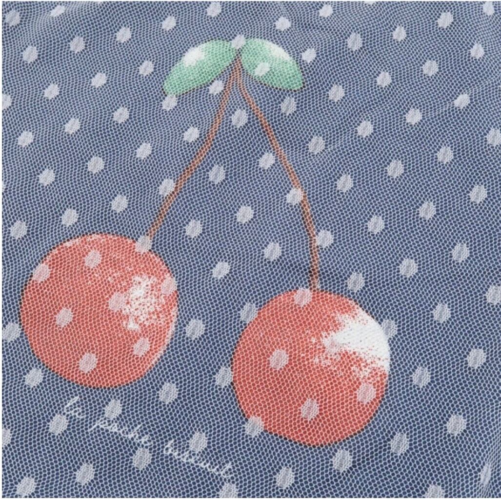 大きなさくらんぼ柄にドットチュール生地を重ねたガーリーな半袖Tシャツ。