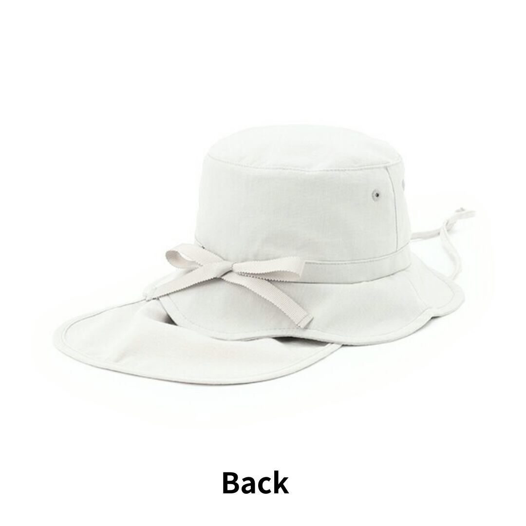 スカラップデザインのつばと首元についた日除けで全方向かわいく!