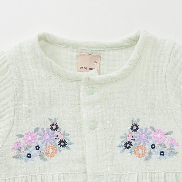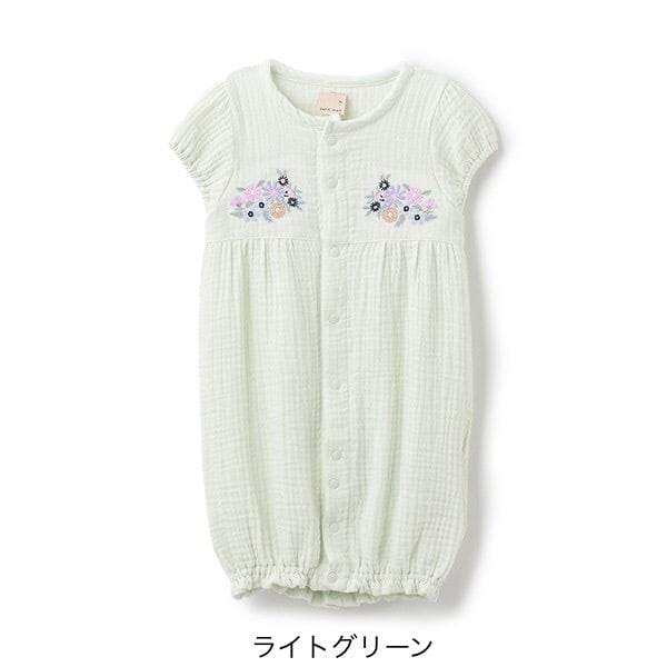 お花の刺しゅうが上品な印象を与えるカバーオールです。