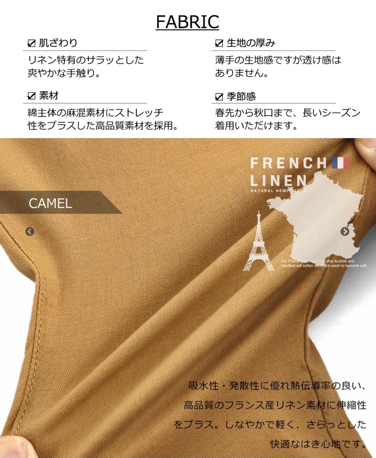 コットン66%、レーヨン16%、リネン15%、ポリウレタン3%