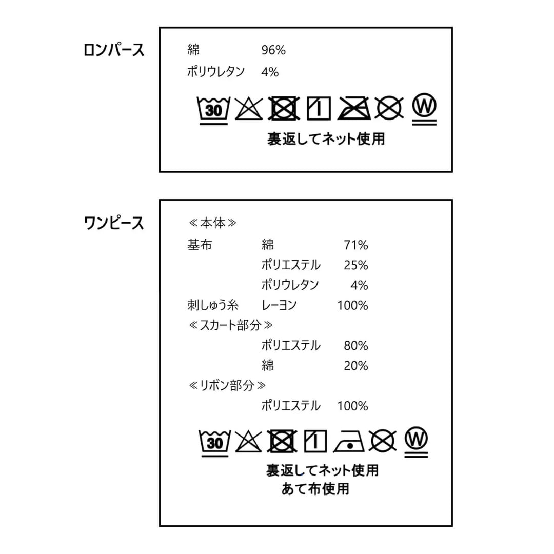 素材 アイボリー・紺_本体_基布_:綿71%/ ポリエステル25%/ ポリウレタン4% 刺?糸_:レーヨン100% スカート裏部分_:ポリエステル80%/ 綿20% リボン部分_:ポリエステル100% ロンパース_:綿96%/ ポリウレタン4%