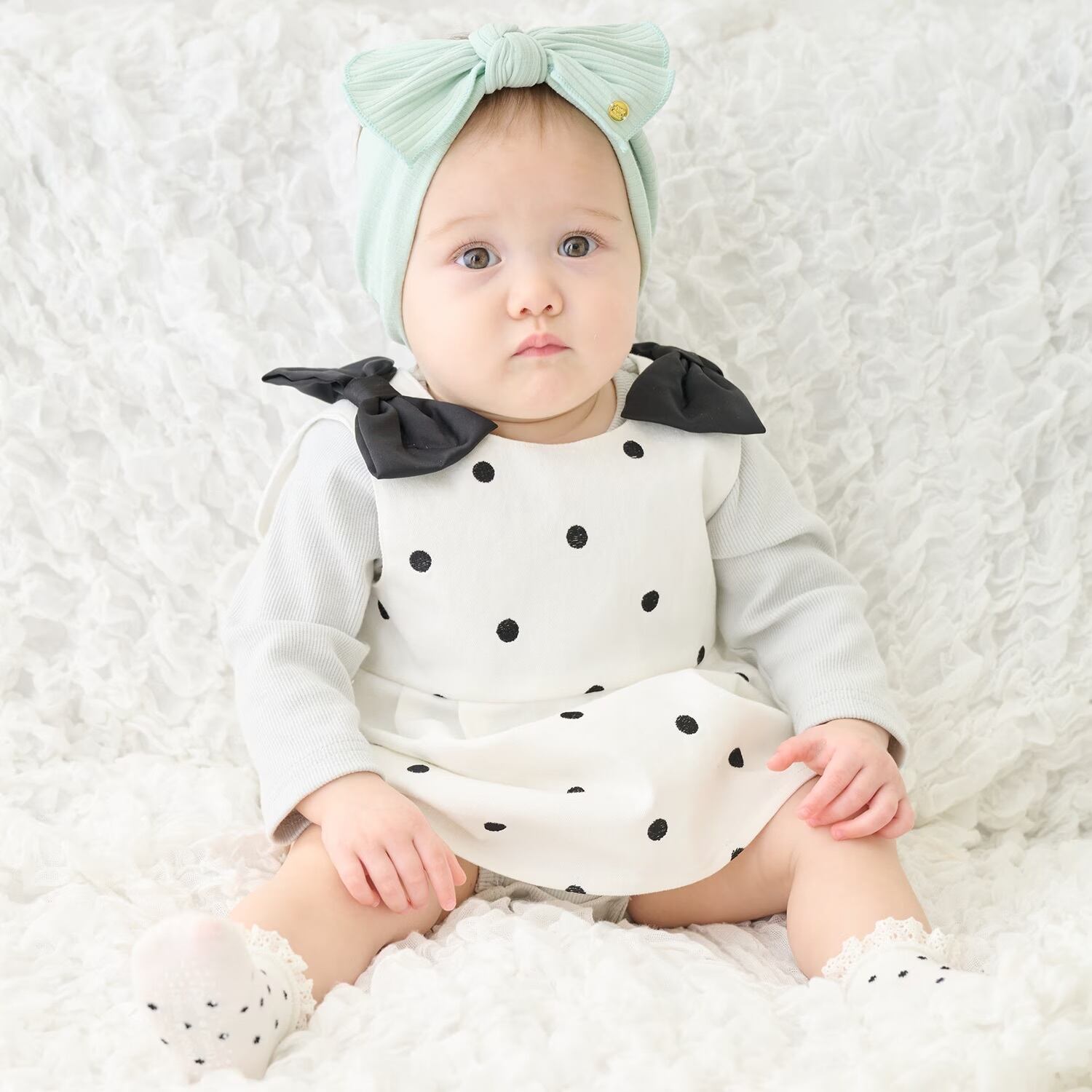 肩の大きなリボンがかわいいワンピースとロンパースのセットアップです。