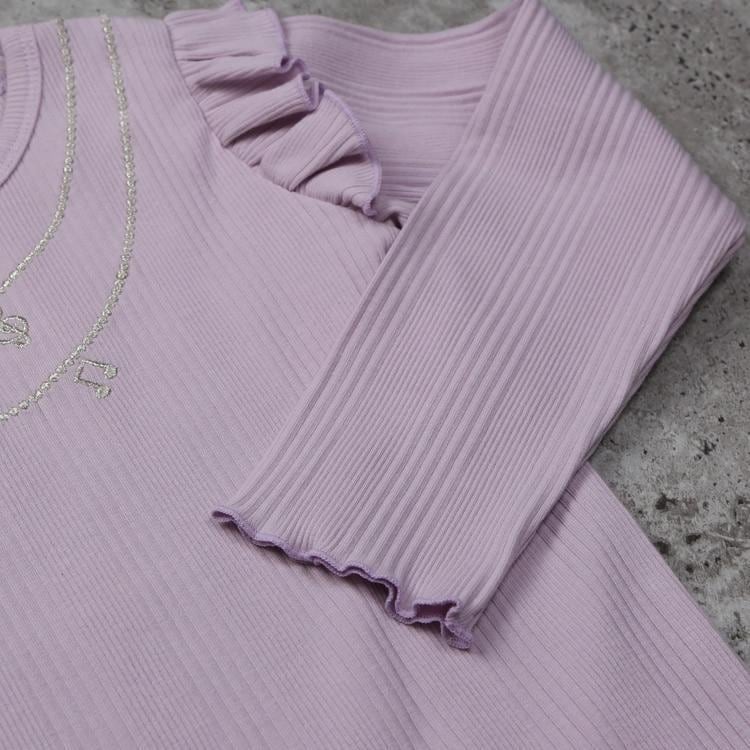 ネックレスのようなキラキラの刺繍とラインストーンが目を引く長袖Tシャツです。