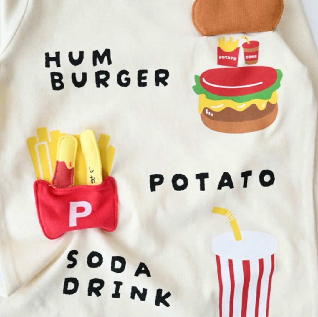 みんなが大好きなキッズセットのロングTシャツです ハンバーガーのバンズがめくれます ポテトのポケットからポテトが引っ張れます。