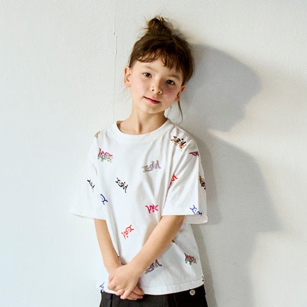 カラフルなミルズロゴの総柄プリントが新鮮なTシャツです。定番のビッグシルエットが一枚でも着映えするポイント。